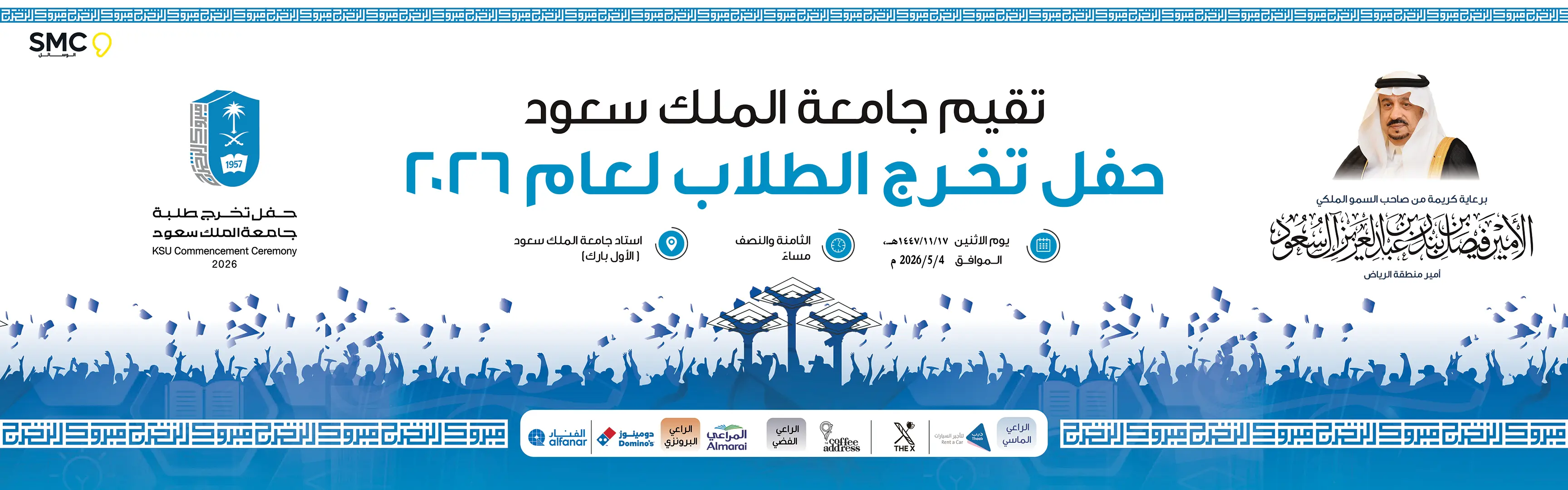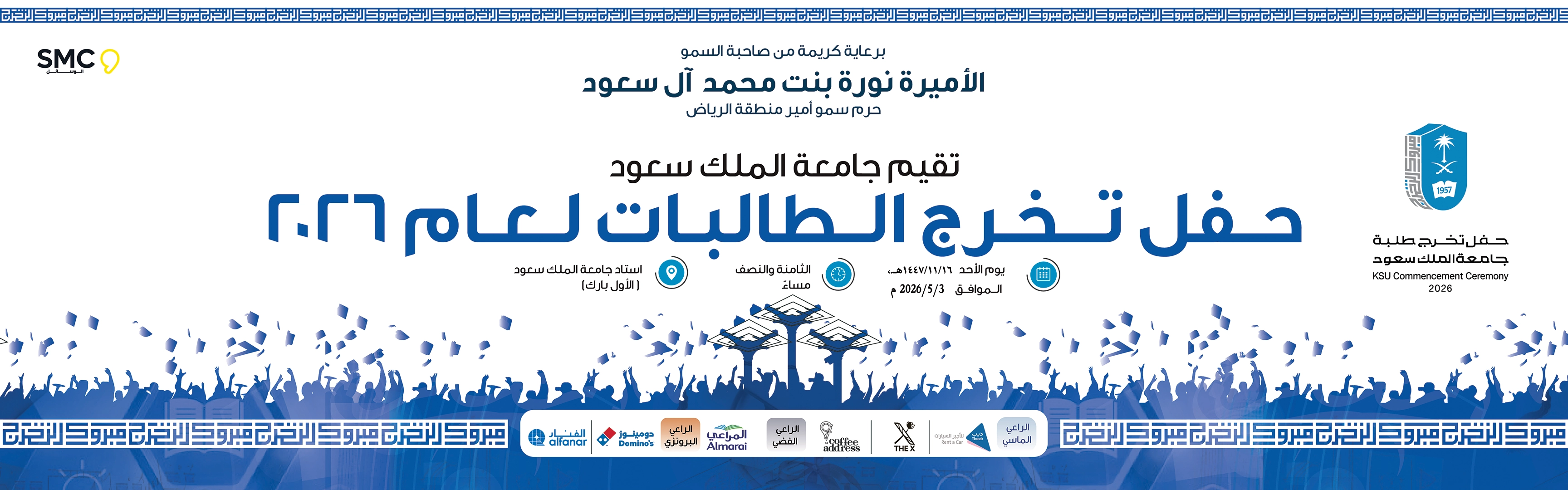حضور الطلبة الخريجين لمقر الحفل (أستاد جامعة الملك سعود- الأول بارك) للتفويج للمقاعد المخصصة من الساعة 5 م - 7:30 م ( ولن يسمح لأحد بالدخول بعد هذا الوقت ) لذا يرجى الحضور قبل الموعد بوقتٍ كافٍ.